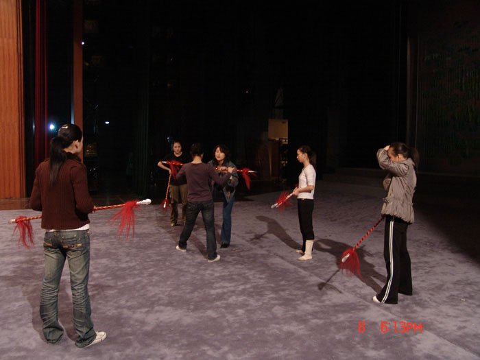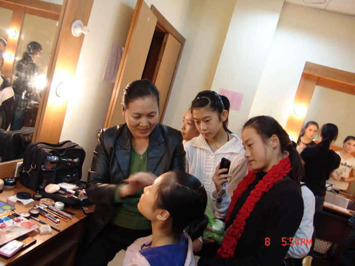 在剧场后台,最忙碌的要数戏剧科的老师,每个人都恨不能分成两个人甚至三个人来用。钱丽文老师一边给学生化妆,一边还不忘叮嘱学生带好参茶;俞会珍老师是当天彩排的“总调度”,一手拿着笔记本,一手拿着对讲机,顾不上身体不适,不停地前台后台现场指挥;而王莲萍老师,已经看不见她正常的走路,只见她一路小跑拉上几个学生练“扔抢”,随即又冲回来帮学生换服装,至于吃饭这事早忘得一干二净----