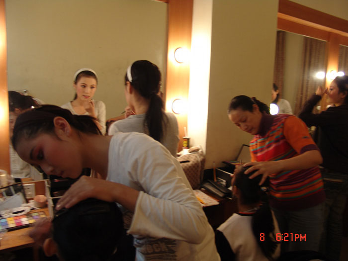 最引人注目的是扮演许仙的郭茜云和扮演白娘子的郑晓。老师专门为她们俩煮泡好的参茶,一人一壶。在化妆老师面前端坐的郭茜云比平时安静地多,她那双有些近视的眼睛本来似双非双,经富有经验的洪巧珍老师一描一绘后,一下子变得炯炯有神、魅力十足。待包好头、带好帽子,一个俊朗貌美的小生让人眼前一亮。由于此次的演出正逢期中考试,不少同学都随身带着复习资料,趁着化妆间隙还抓紧时间复习一下。郭茜云也不例外,对考试显然没有像演出那样胸有成竹,于是偶尔拿出资料看上几眼,但一会又去开几下嗓子,对于她,开嗓远比背功课来得轻松。