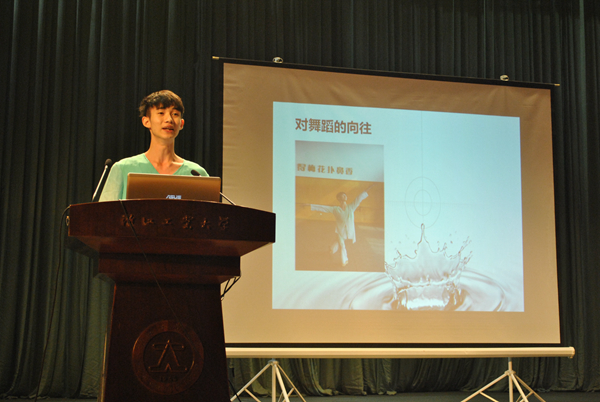 陈浩凯为舞蹈系2010级舞蹈表演一贯制班学生,2013年“中国大学生自强之星”提名奖获得者。在校期间,他获奖累累:全国职业院校技能大赛高职组中国舞表演二等奖、浙江省职业院校技能大赛高职组中国舞表演一等奖、浙江省大学生艺术节舞蹈类一等奖、浙江省音乐舞蹈节单双三人舞组三等奖等各类专业比赛奖项。在现场展示阶段,陈浩凯通过PPT演讲及精彩的舞蹈展示,获得了全场一致好评,最终胜出,成为浙江省优秀大学生的典范和楷模。