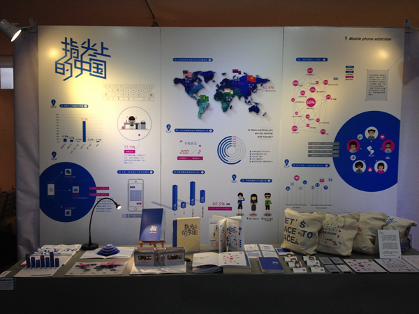 本次大赛主题为“数据·链接”,学生们通过海报、字体、书籍等方面的设计,对在大数据时代中所产生的热门话题进行信息图像化的表现。荣获特等奖的《指尖上的中国》是一部针对“低头族”频频增多现象而设计的作品,旨在呼吁大众“放下手机,面对面交流”,赢得一致好评。专家评委点评说:“作品选题好,具有社会价值和意义。”