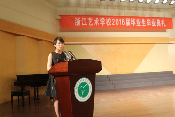 院长黄杭娟在毕业典礼上致辞。她向如期完成学业的同学们致以热烈的祝贺,向辛勤耕耘、兢兢业业的老师们表示衷心的感谢,向始终关心、默默支持的家长们致以由衷的敬意。她寄语每一位毕业生,当初懵懂的孩子如春笋般带着稚气,如今已成长为一名身怀技艺、锋芒初露的青年。求学过程中的苦、辣、酸、甜,各种滋味你们自己忘不了,老师们更难以忘怀。想起了你们为了演绎一个作品,在排练厅里“雕琢”一遍又一遍;想起了你们通过勤奋努力,在舞台上、在比赛中脱颖而出,展现出所有的精彩……这一切都已深深地驻留在母校老师的记忆里,更沉淀在“浙江艺术学校”的深深底蕴中。在同学们长大成人、走向大学的里程碑时刻,黄杭娟代表母校老师,向同学们提出了三点期望。一是保持相对乐观的情绪,人生路上必定会遇到曲折、责难和误解,只有不断反思,以乐观向上的态度回归原点,调整方向,人生的发展空间才会越来越广阔。二是具有认真做事的毅力,这是人最终成功的决定因素,只有脚踏实地,做好事情,才会收获“真刀真枪”的本领。三是常怀“空杯”心态,人外有人,天外有天,唯有空杯之心才能不断地创造奇迹。