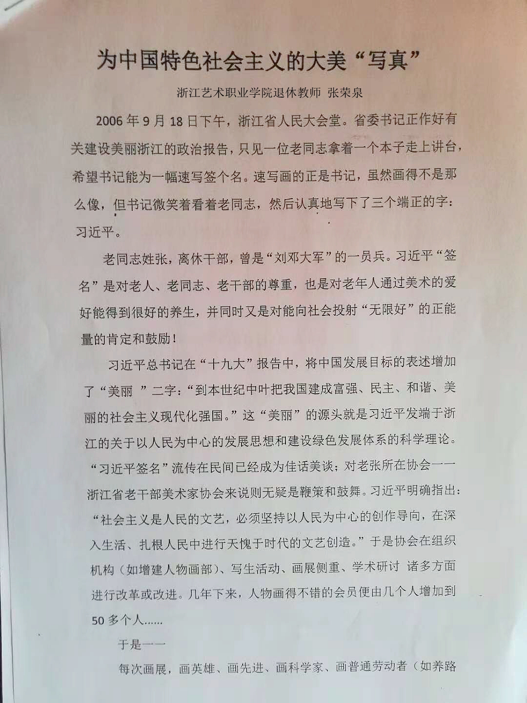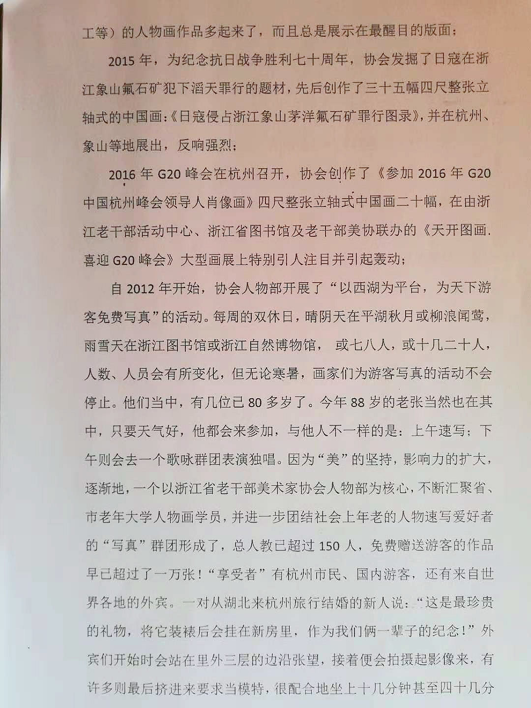 《为中国特色社会主义的大美写真》记录了作者在浙江省老干部美术家协会先后担任副主席、常务副主席兼秘书长期间,一群曾经饱经沧桑并为立国、建国做出过努力和贡献的老人,正以特殊的方式表现着生活在盛世的修身养性和助人奉献的愉悦。