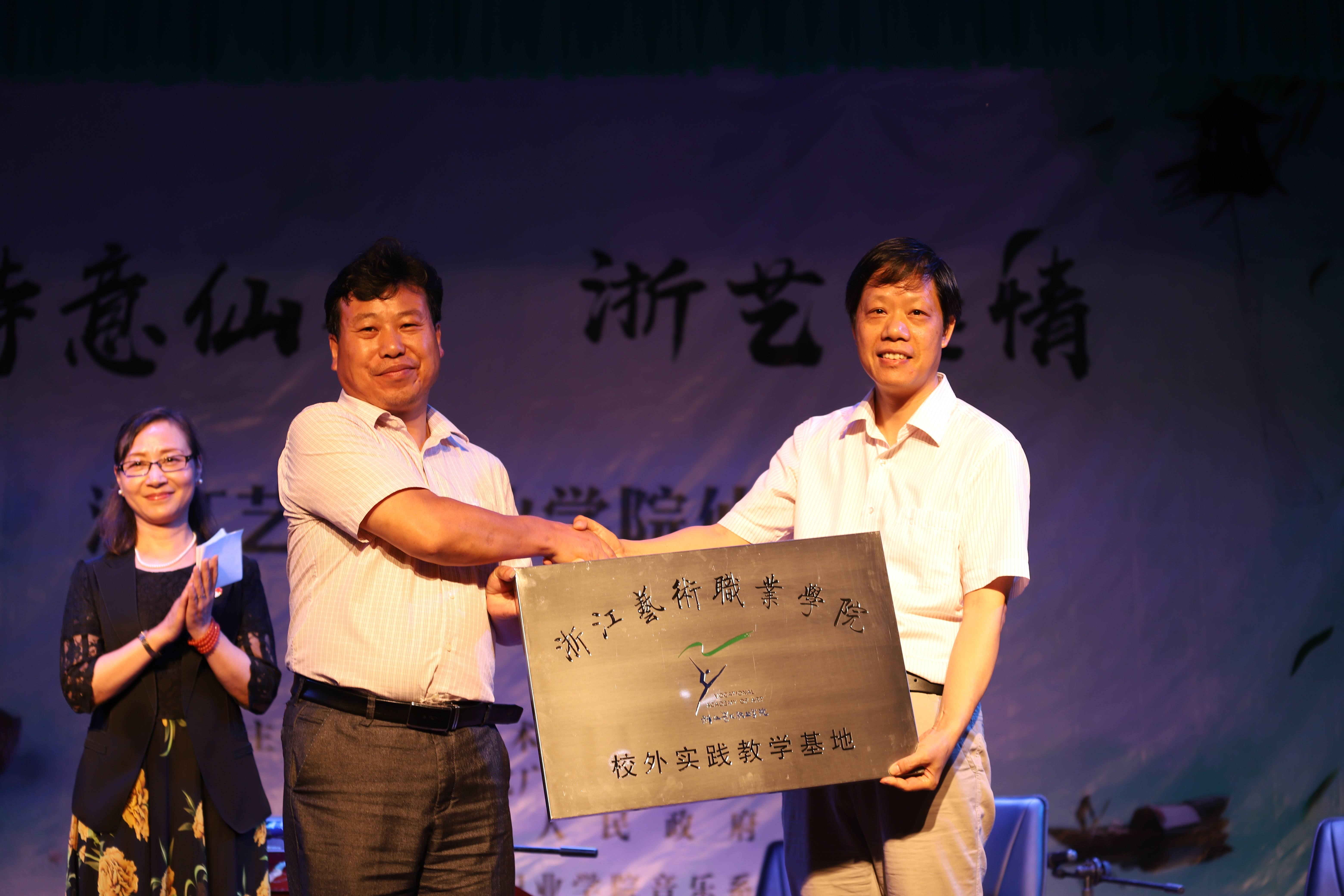 6月29日晚,教学实践基地授牌仪式在埠头镇大庄村文化礼堂举行。浙艺院长黄杭娟、党委委员、纪委书记徐芳,仙居县副县长陈伟鹰、埠头镇镇长郑海军参加授牌仪式。仪式由仙居县文广新局局长丁永德主持。