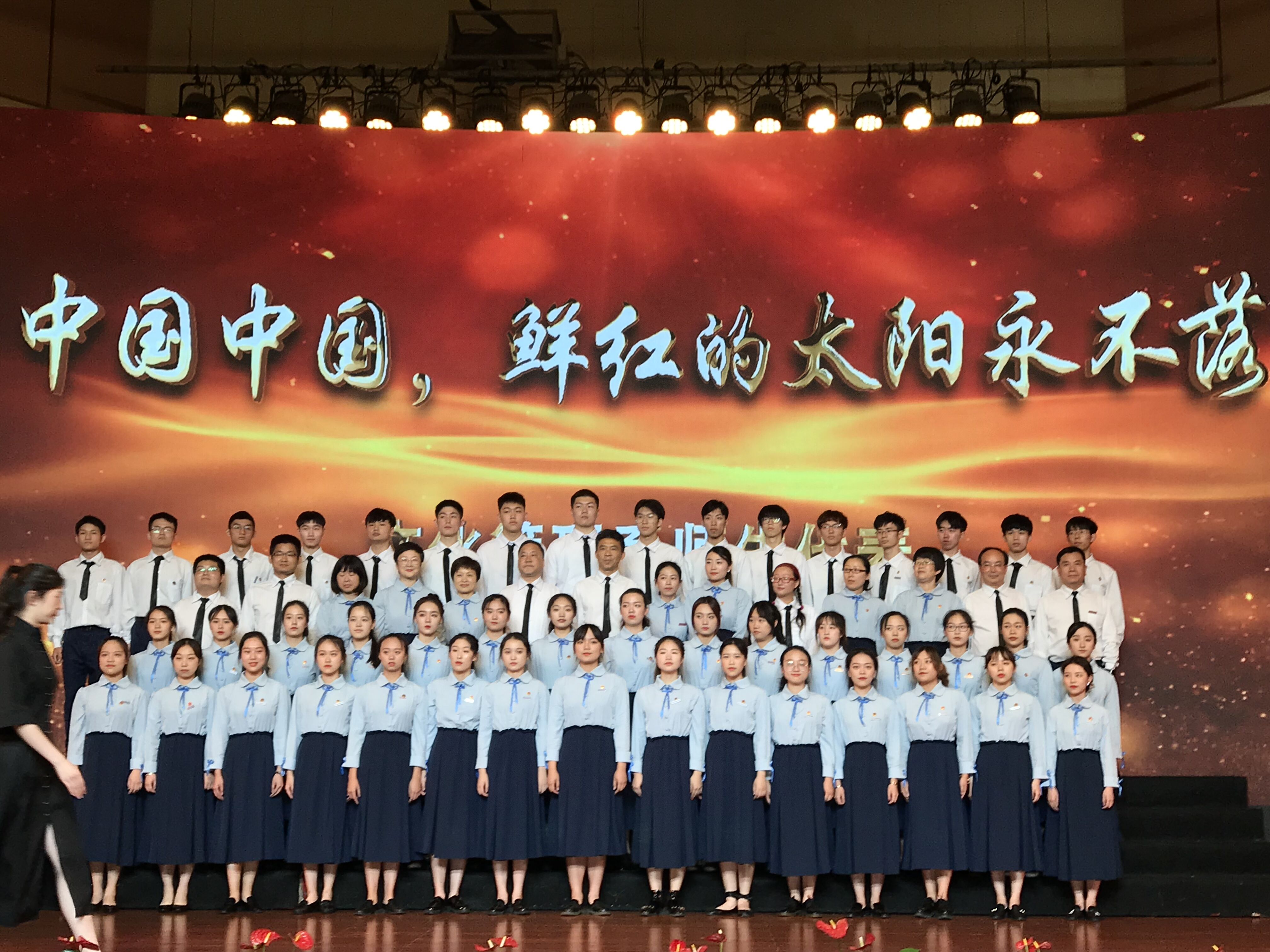 音乐系的百人合唱团阵容强大,《在灿烂的阳光下》有领唱、合唱、朗诵、乐器演奏和舞蹈等多种表现形式,台上台下呼应,慷慨激昂的歌声获得如雷般掌声。舞蹈系合唱团和影视技术系合唱团分别演唱了《保卫黄河》,各具特色,舞蹈系的红绸舞为这首歌增添了刚劲有力的气概,影视技术系的军装演出服整齐干练,两支队伍歌声嘹亮,表达了对黄河、对祖国母亲炙热的感情。“五十六个星座,五十六枝花,五十六族兄弟姐妹是一家”美术系合唱团带来的《爱我中华》,由全体党员教师和学生代表共同演唱,近年来我校积极响应教育部关于内地高校招录少数民族学生的相关政策要求,每年都录取一定比例的少数民族学生,表演的学生中有少数民族学生代表,他们用载歌载舞的形式表达中华儿女一家亲。