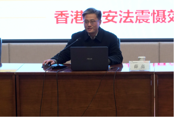 薛亮围绕授课主题,从不容挑战“一国两制”底线、正确看待“一国两制”内涵、稳步推进“一国两制”实践、坚决筑牢“一国两制”根基等四个方面开始讲授。他结合视频资料,通过“修例风波”等反中乱港势力公然挑战“一国两制”底线的实例指出,任何危害国家主权安全、挑战中央权力和香港特别行政区基本法权威、利用香港对内地进行渗透破坏的活动,都是对底线的触碰,都是绝不能允许的。