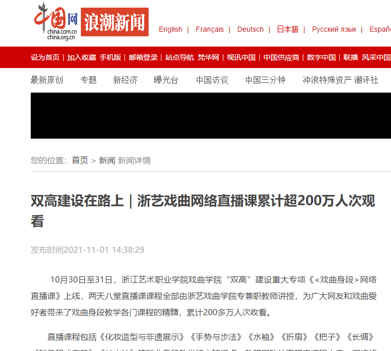 中国网-浪潮新闻:双高建设在路上|浙艺戏曲网络直播课累计超200万人次观看