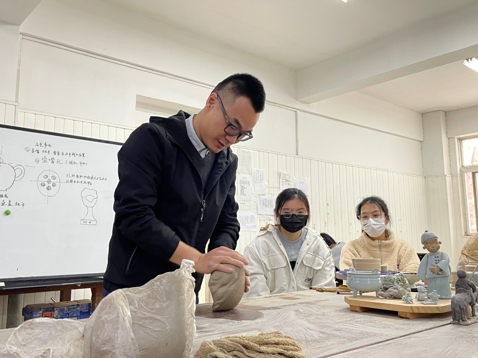 手工艺学院教师郑源雷为同学们讲授基础泥塑知识,他表示,泥塑在人类发展的历史上,一直伴随着生活不断传承,已经成为中华民族民间艺术的一种,并且走出国门,成为中外文化交流的使者;泥塑作品与音乐作品也有其共通之处,比如状态的相通,对形象的理解与把握等;通过今天的泥塑艺术作品创作,最重要的是学会感受,在实践中感受两个艺术形象之间的共通之处,为学好唱腔设计课提供一些新的思考。