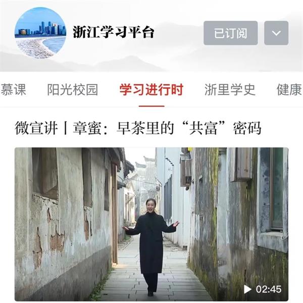 近日,学习强国里一段关于“早茶里的‘共富’密码”的微宣讲视频点击率持续升高,这段视频的主讲人是文教学院21届定向班毕业生章蜜。自2021年毕业至今,章蜜便运用专业所长活跃在乡镇一线,为基层文化事业发展贡献青春力量。