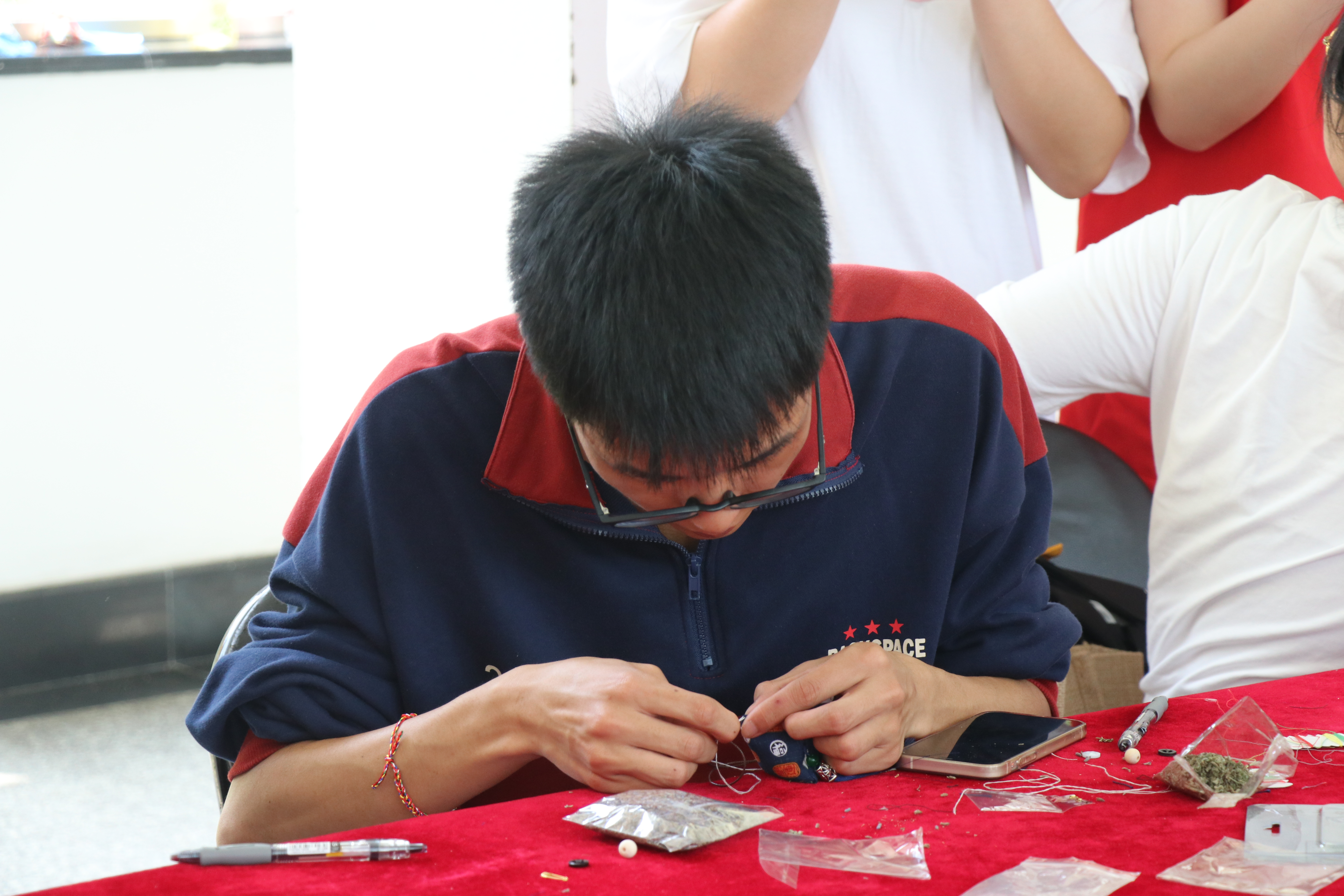 活动体验的师生们首先挑选自己钟爱的布料,将他们裁成12.5x6.5cm的规格,一针一线、细针轻舞、巧手穿梭,将布料缝成一个小布袋。