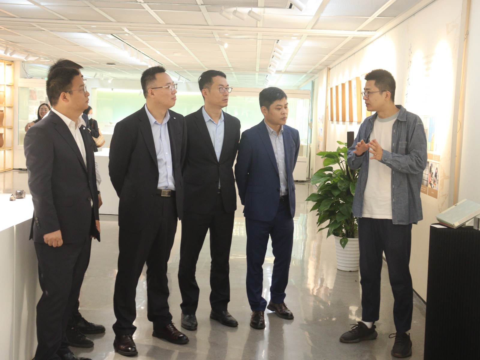 浙江开元旅业集团来访人员参观了学院教学成果展,各教研室的专业老师们陪同参观,介绍了教学成果展中的作品及创作思路,进一步启发了项目化合作运营,走通文旅融合新道路。