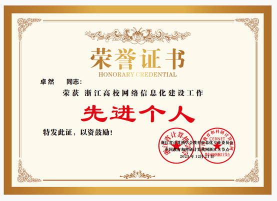 近日,浙江省计算机学会教育信息化专业委员会、中国教育和科研计算机网浙江主节点联合表彰了一批2023年高校网络信息化建设先进单位和先进个人。我校喜获“2023年浙江高校网络信息化建设先进单位-网络安全方向”“2023年浙江高校网络信息化建设先进单位-数字治理方向”两项荣誉,图书信息中心卓然荣获“浙江高校网络信息化建设先进个人”。