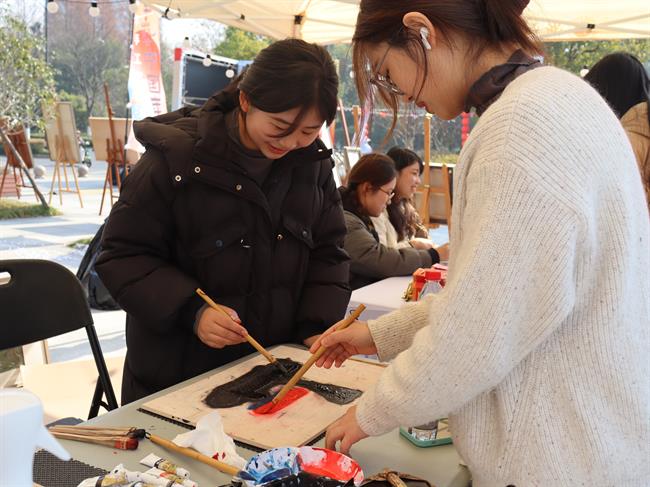 非遗活态展示区与生活美学浙艺课体验区人头攒动,人们在水印木刻悠长的脉络与繁复的技艺中思考,在扇面上体悟生活中的艺术,在陶艺中传承历经千年的手艺巧思。同学们纷纷上前体验非遗技艺,感受传统手工艺的独特魅力。