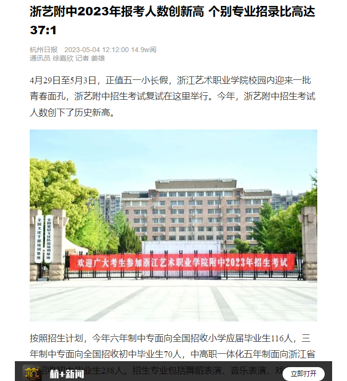杭州日报:浙艺附中2023年报考人数创新高 个别专业招录比高达37:1