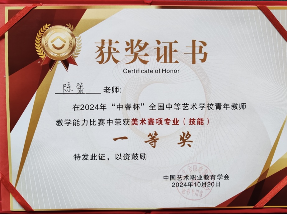 近日,由中国职业教育学会主办,中国艺术职业教育学会中等艺术职业学校工作委员会、重庆艺术学校承办的2024年“中睿杯”全国中等艺术学校青年教师教学能力比赛现场决赛(声乐、美术赛项)在重庆艺术学校举行。经过角逐,我校设计学院青年教师陈策斩获美术赛项专业(技能)一等奖、全能二等奖。