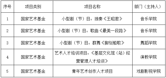 日前,国家艺术基金管理中心公示,国家艺术基金2025年度资助项目立项名单。我校获5项国家艺术基金项目立项,其中艺术人才培训资助项目1项,小型剧(节)目和作品创作资助项目3项,青年艺术创作人才资助项目1项,创历史最好成绩。