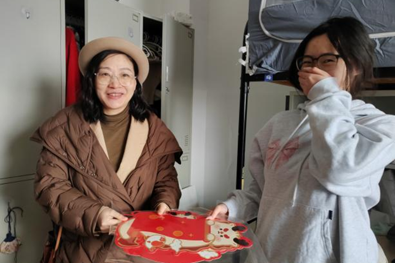 设计学院领导班子、全体班主任和辅导员走访学生寝室,细心查看宿舍环境,关注每一位学生的返校情况,询问学生的学习生活需求,为学生送上关怀,叮嘱学生认真完成劳动教育,保持整洁干净的寝室卫生环境。老师们还精心准备了富含龙年元素的春联、挂件,写满了对学生的美好寄语,让浓浓的年味与深深的人文关怀交织在一起。