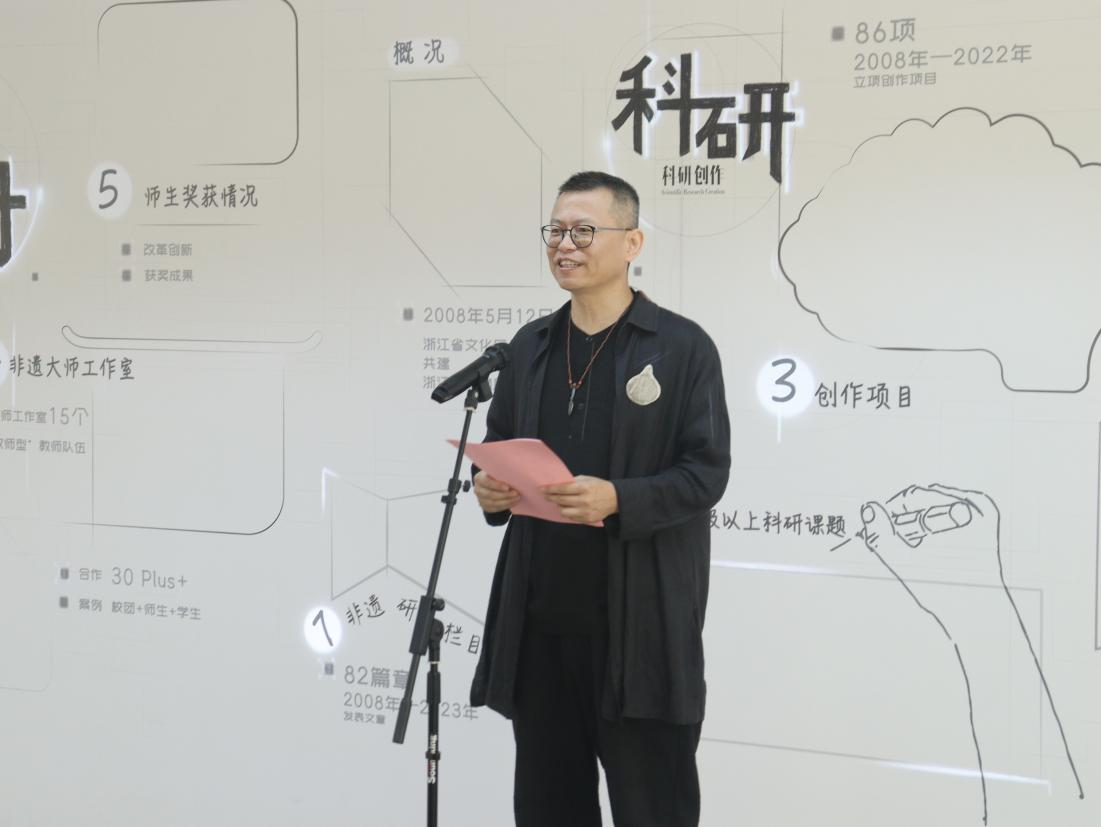 薛亮致辞。他指出,浙江非遗传习院、非遗创意产业学院自成立以来,沿着五年建设发展规划稳步前进,在非遗领域深耕传承和创新,致力于非遗保护传承、教学科研和产教融合,希望通过师生的共同努力,传承好宝贵的非遗知识,让灿烂的传统文化在新时代绽放出新光彩。他对本次展览的举办表示祝贺,并期待更多优秀的非物质文化遗产展览在浙艺展出,向全社会传播和展示具有悠久历史和时代魅力的优秀传统文化。