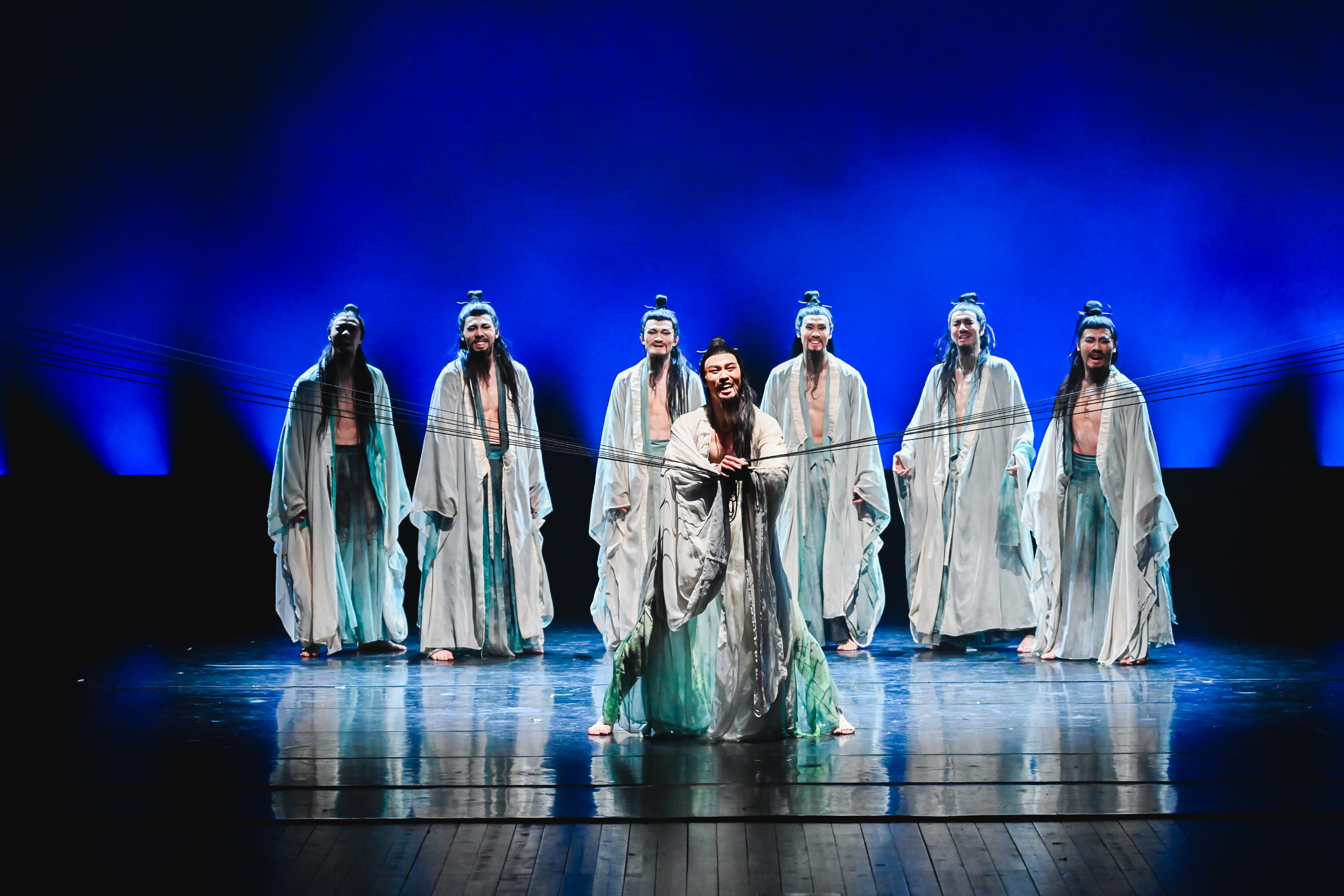 群舞《广陵绝响》以竹林七贤的精神领袖——嵇康为创作原型,以千古绝响的古琴曲《广陵散》为依托,用琴弦搭建出多重舞蹈空间,展现了一段慷慨激昂的古典舞韵,体现了中国古代深厚的传统文化底蕴。
