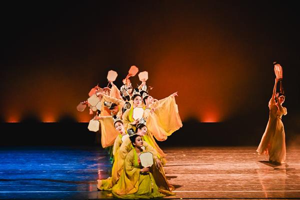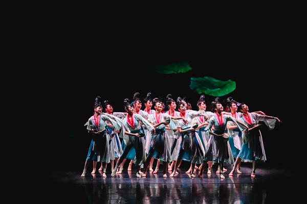 群舞《莲鼓乐歌行》源自唐代诗人李颀的名诗《采莲》,以古代越地江南人文生活画面为背景,塑造了一幅“西子湖畔十里荷花”的人间美境,展现了江南古典舞蹈的典型特征和中华美学的独特韵味。